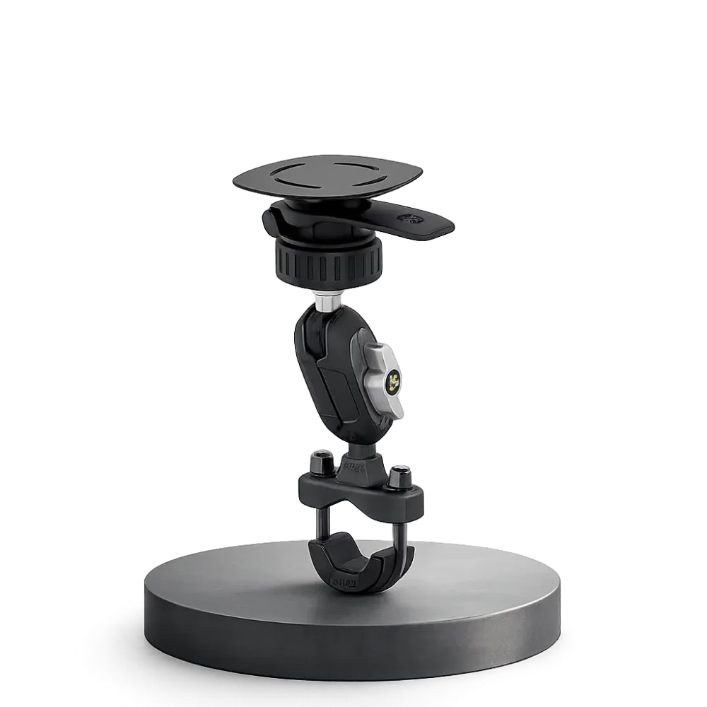 Тази стойка за телефон за мотор е създадена за сигурно и стабилно използване на смартфон по време на каране. Конструкцията комбинира U-образно захващане към кормилото, антивибрационна система и двойна ball head връзка, което осигурява стабилност дори при неравен терен или високи скорости.